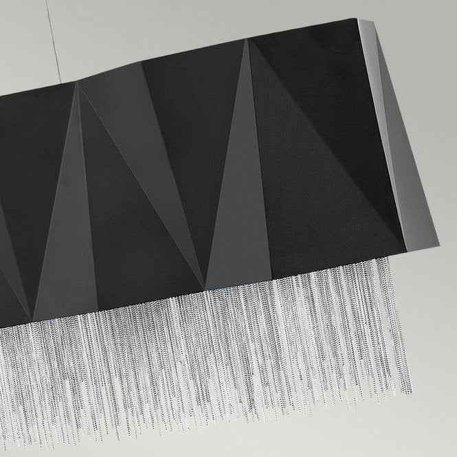 Sculptural and exotic, Zuma tantalises with a purely contemporary form. The over-scaled geometric pendant, linear chandelier and wall light silhouettes are softened with layers of fine jeweller’s chain flowing from the epicentre. Available in Satin Black with either Silver or Gold chain accents.